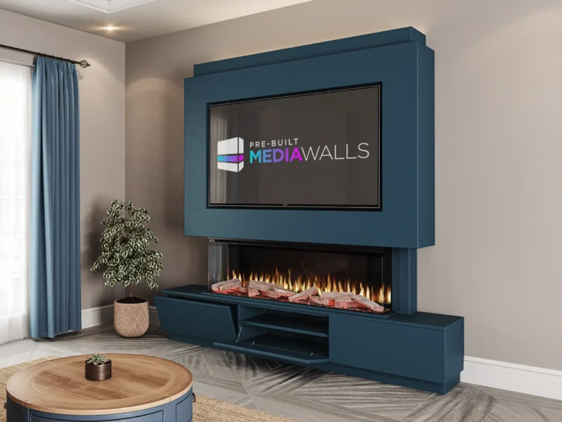 Premium Pre-Built Media Wall with our HORIZONSeries 60 Lite Inset Fire & 2 Door Storage Solution